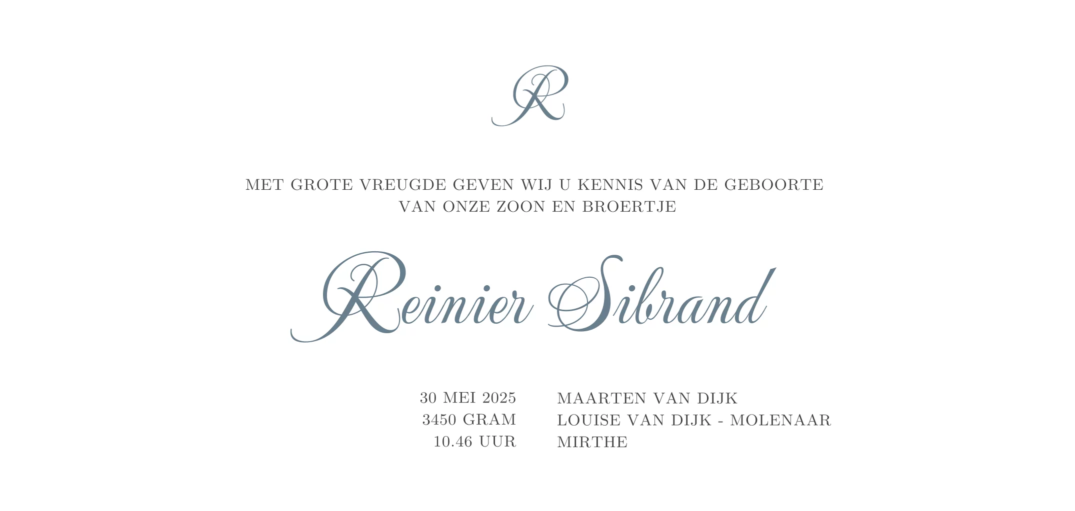 De teksten op dit klassieke geboortekaartje hebben een warme oud blauwe kleur. Je maakt in de editor je eigen klassieke geboortekaartje. Dit geboortekaartje wordt gedrukt op het formaat 10 bij 21 cm.