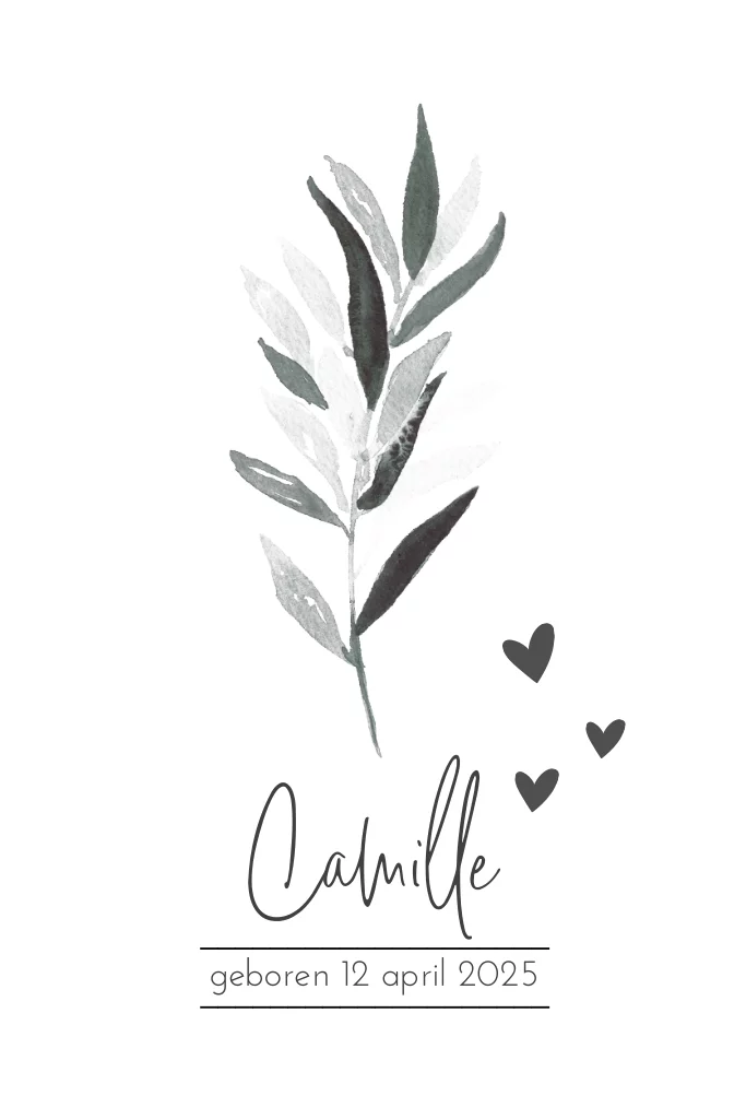 Botanisch geboortekaartje jongen met blaadje en hartjes