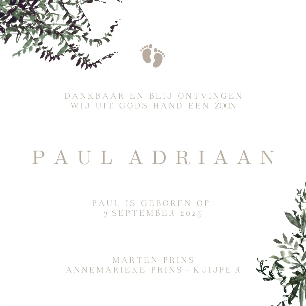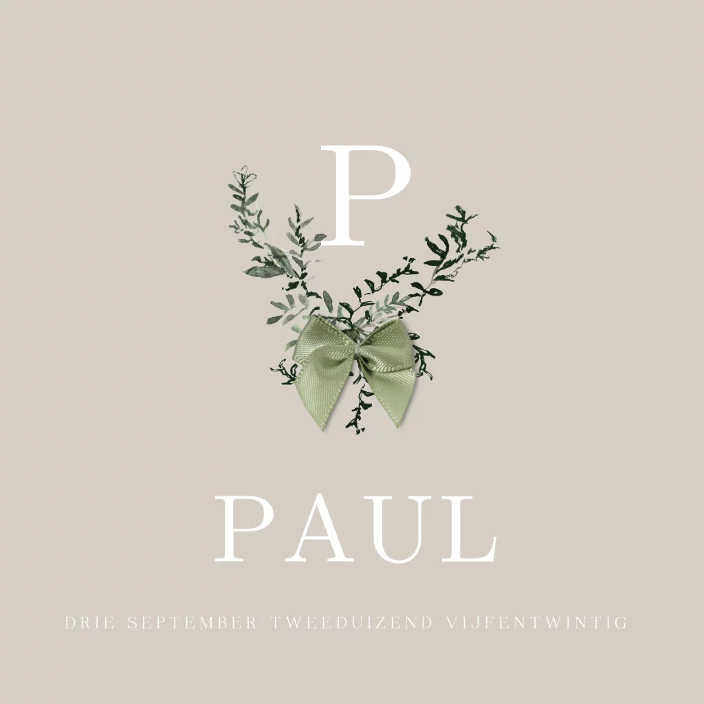 Botanisch geboortekaartje jongen met strikje en blaadjes
