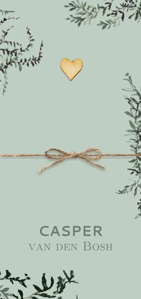 Een origineel botanisch geboortekaartje voor jullie zoontje maak je door er een echt houten hartje op te plakken. Strik ook nog een touwtje om het geboortekaartje voor een uniek effect. Dit geboortekaartje wordt gedrukt op het formaat 10 bij 21 cm.