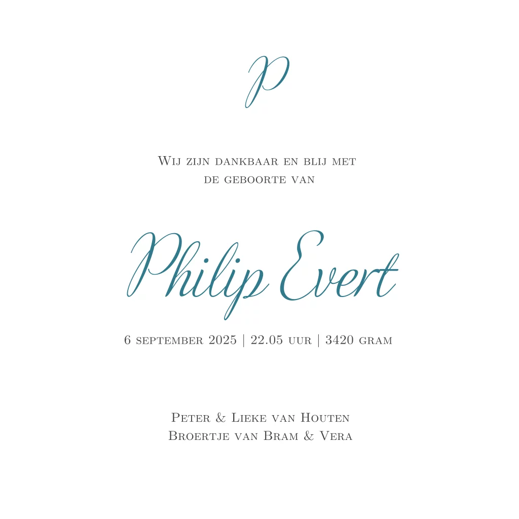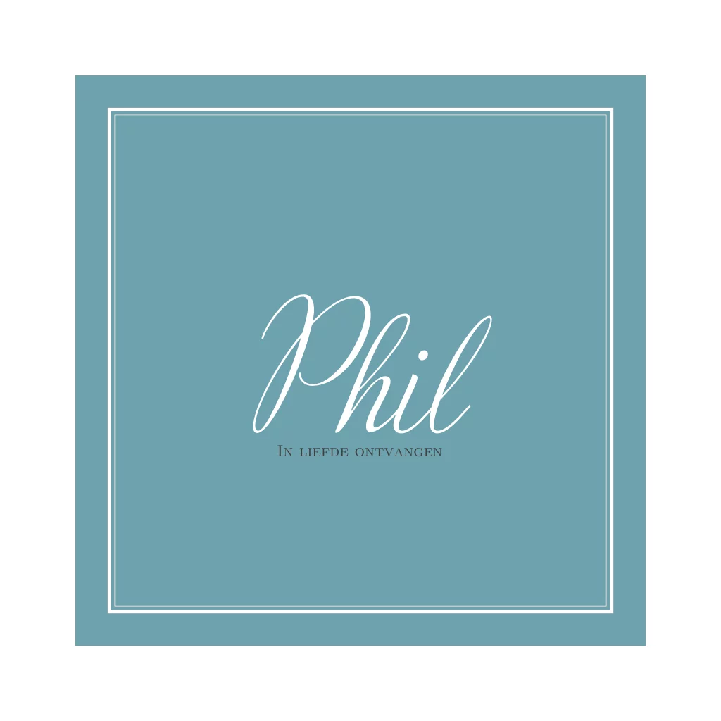 Jongens geboortekaartje met blauw kleurvlak die je ook een andere kleur kunt geven in de editor. Zo maak je altijd een unieke klassiek geboortekaartje.