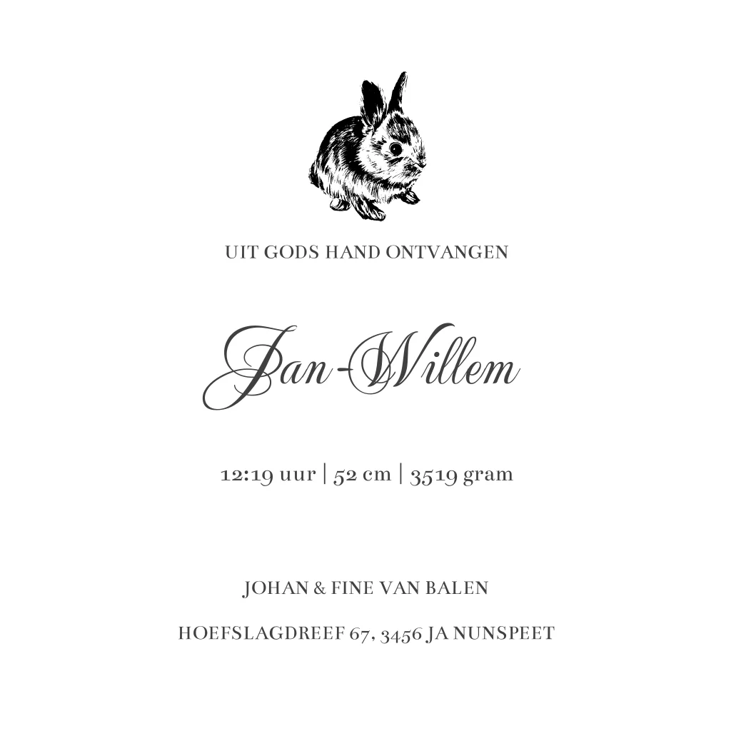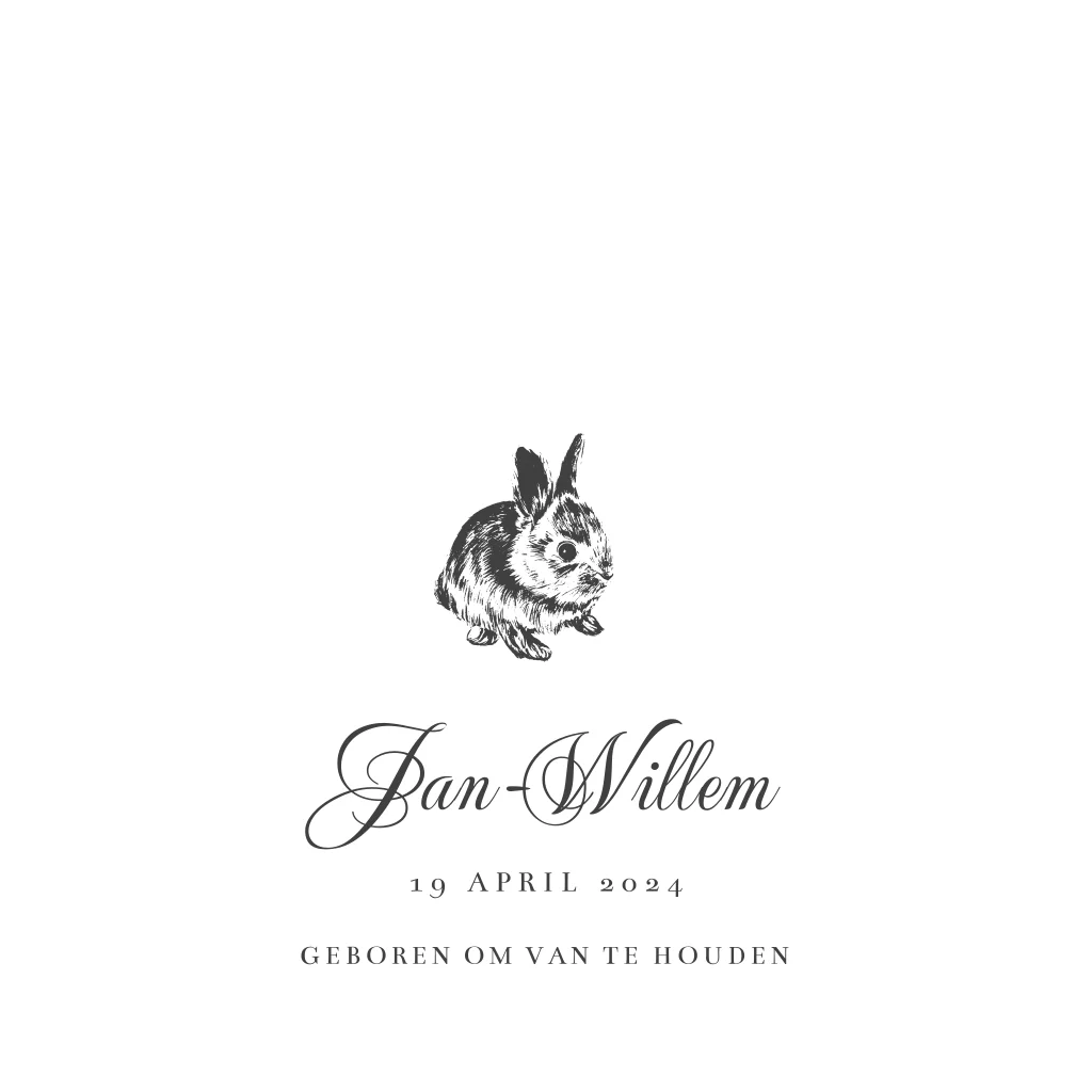 Lief klassiek geboortekaartje met konijntje. Je kunt in de editor de naam en tekst aanpassen. Daarna bestel je een proefdruk.