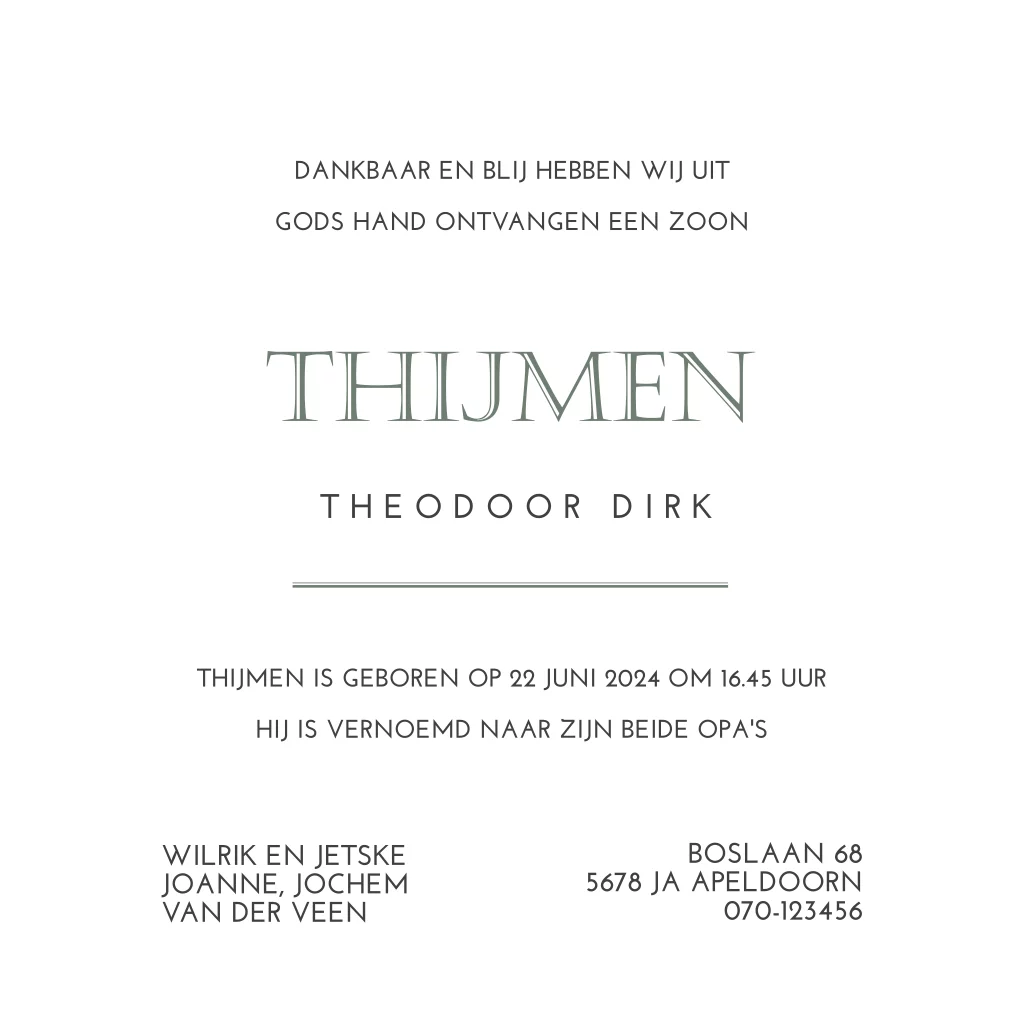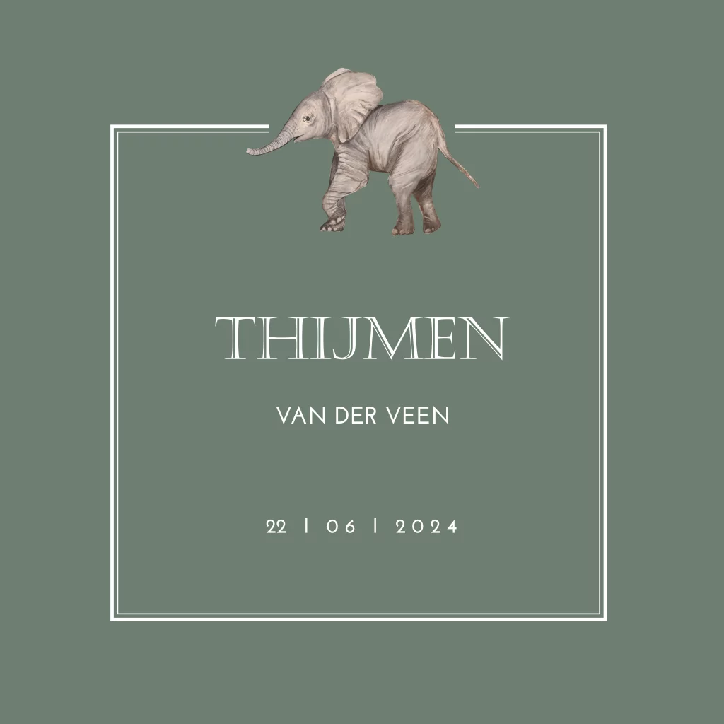 Een lief geboortekaartje met olifantje als afbeelding. In de editor kun je ook een ander mooi getekend diertje kiezen. Zo maak je altijd een origineel geboortekaartje.