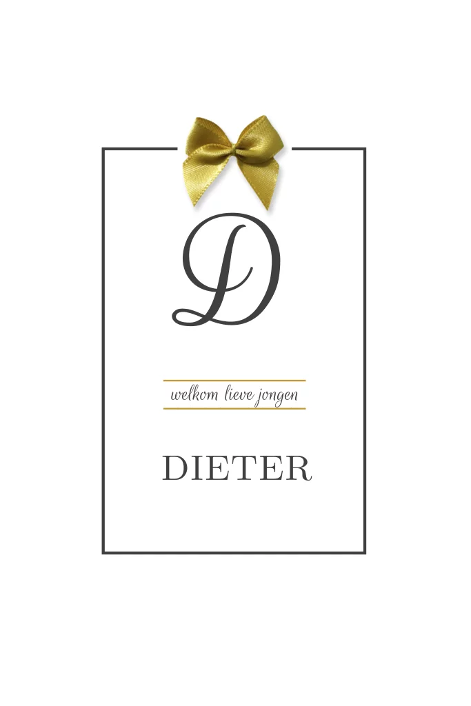 Laat het initiaal van jullie zoon er uitspringen op dit klassieke geboortekaartje met strikje in de kleur goud. Je hebt keuze uit 6 kleuren strikjes.
