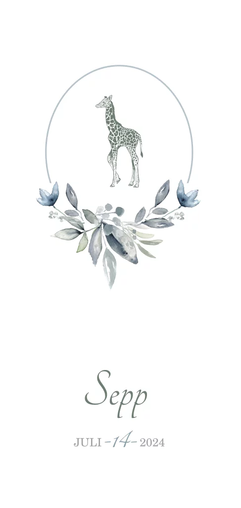 Romantisch geboortekaartje met giraf en blauw bloemen
