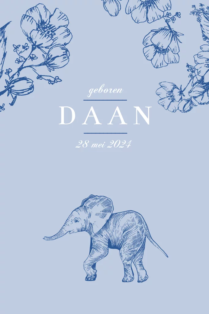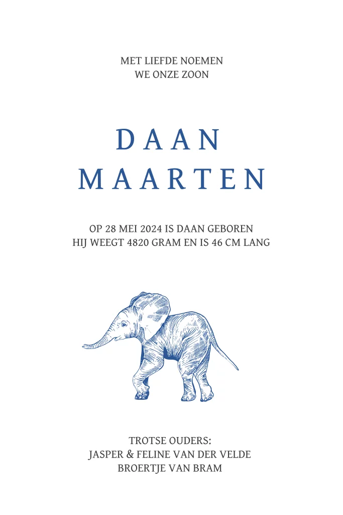 Een lief olifantje op dit jongens geboortekaartje. Liever een ander diertje? In editor vind je een map met dieren. Uniek voor Gloria Cards getekend.