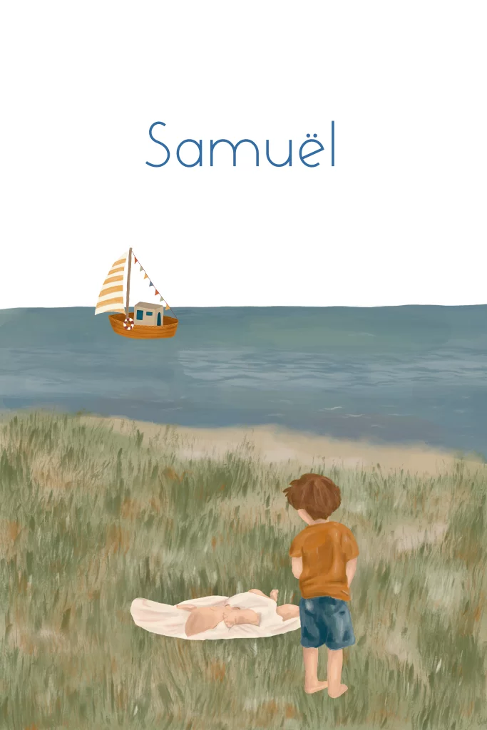 Stoer geboortekaartje voor een jongen. Naast de baby staat een grote broer, samen kijen ze naar een zeilbootje dat over het water vaart. Dit kaartje is helemaal naar wens aan te passen, zodat het perfect past bij jullie gezin.