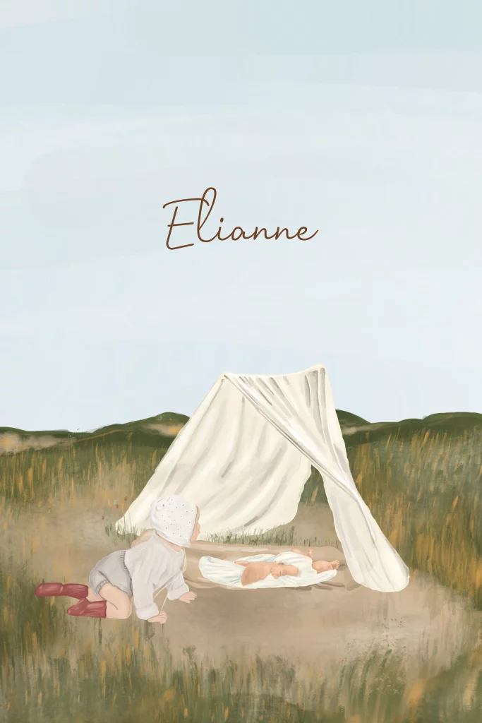 Schattig geboortekaartje voor een meisje. De grote zus kruipt om haar zusje heen terwijl ze samen genieten van de zon in de duinen. De kaart is helemaal aan te passen naar jullie wens en situatie zodat hij naadloos aansluit op jullie.