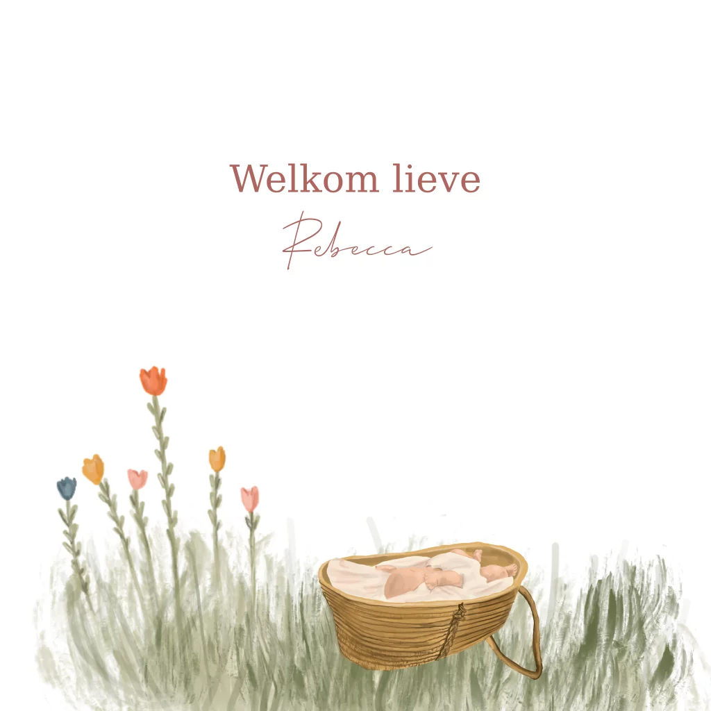 Geboortekaartje voor een meisje of jongen. Op het kaartje staan een wieg met daaromheen bloemen en gras. De kaart is volledig aan te passen zodat hij bij jullie gezin past.