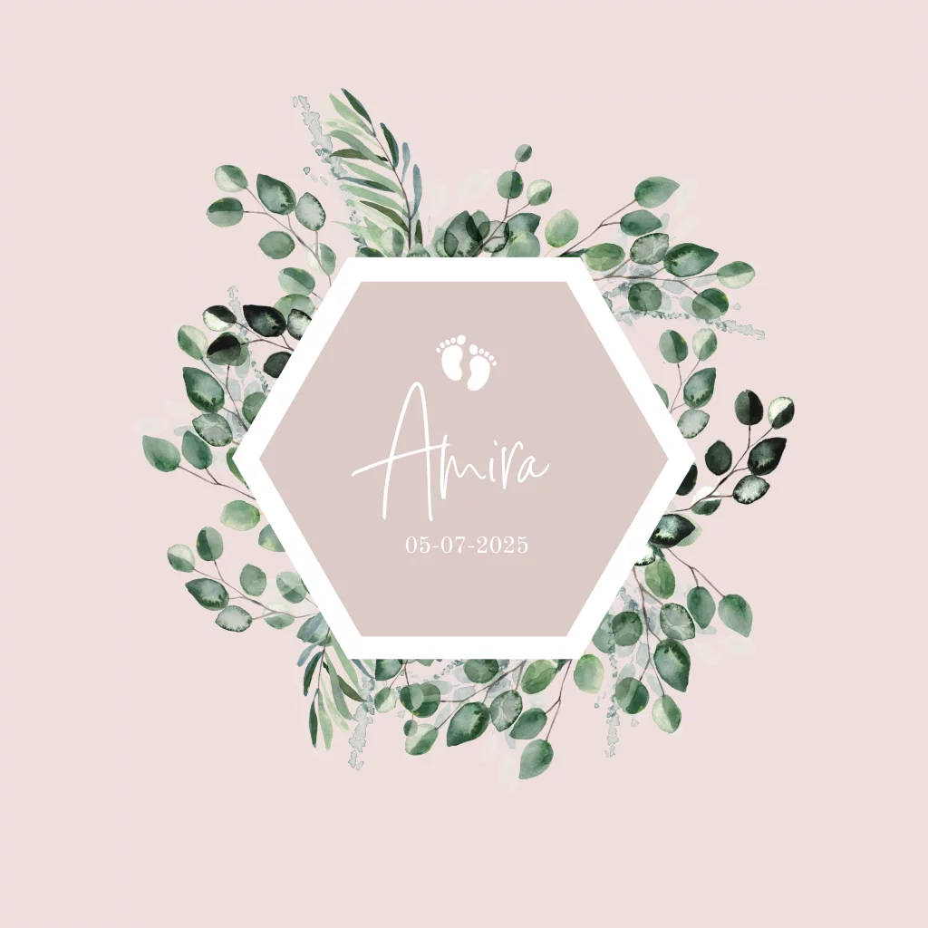 Een roze geboortekaartje met botanische blaadjes voor een mooi meisjes geboortekaartje.