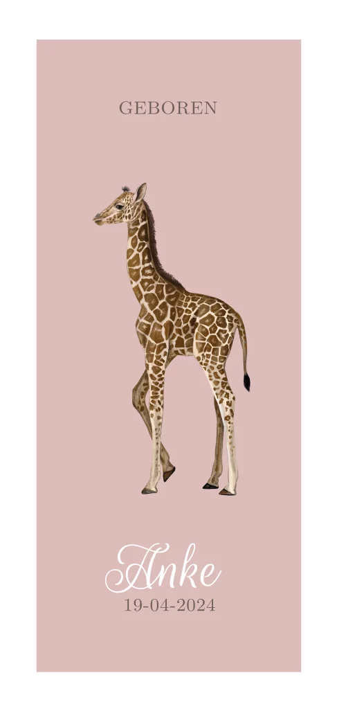 Een meisjes geboortekaartje met giraf die gedrukt wordt op het formaat 10 bij 21 cm. Je kunt in de editor ook een van onze andere diertjes vinden.