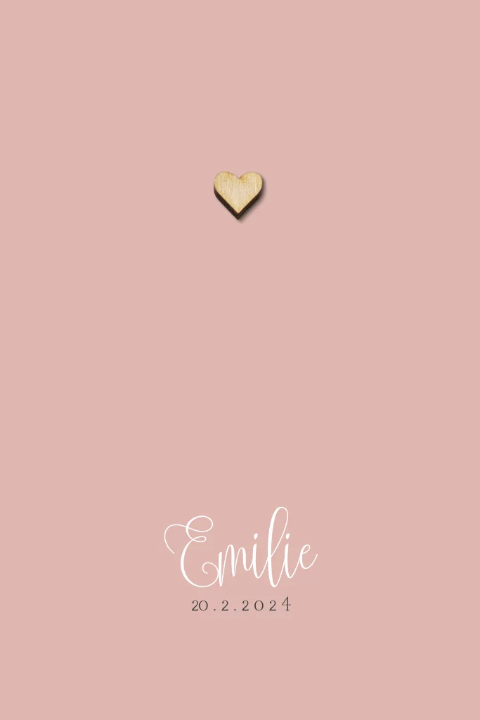 Geboortekaartje met houten hartje die je zelf op het kaartje mag plakken.