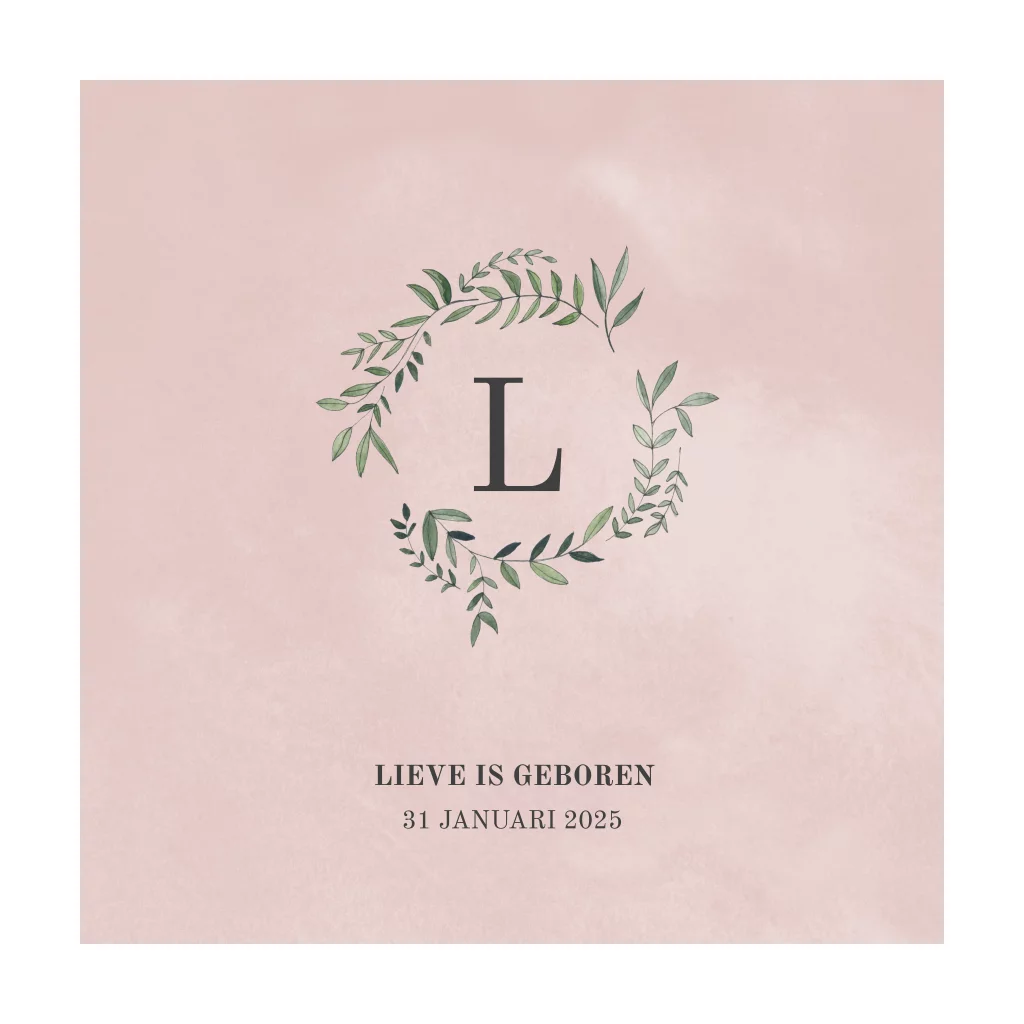 Geboortekaartje meisje met roze achtergrond en bladeren krans