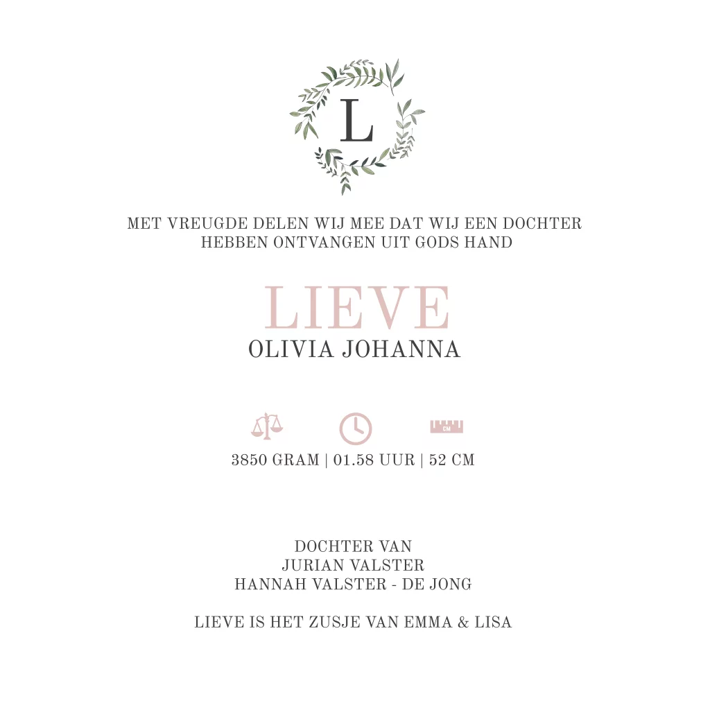 Maak je eigen meisjes geboortekaartje met dit voorbeeld. Eenvoudig aan te passen in de editor.