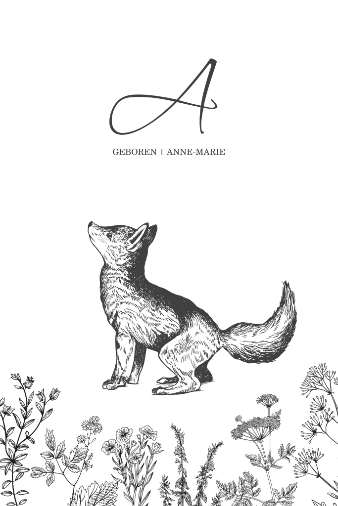 Geboortekaartje voor een meisje met een vosje. Plaats bovenaan het initiaal van jullie kindje.