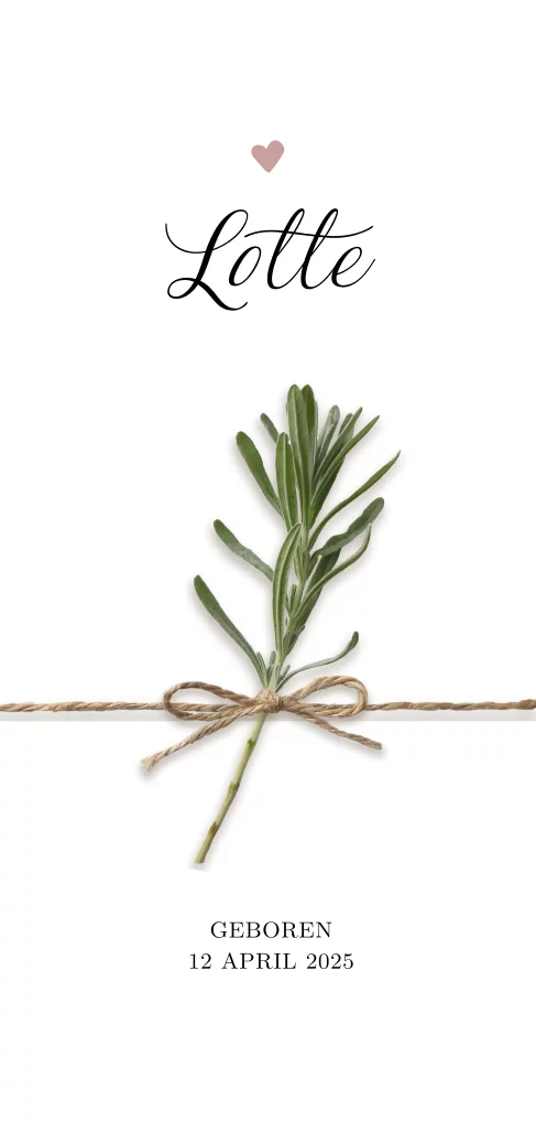 Geboortekaartje dochter met hartje en touwtje (takje zelf regelen)