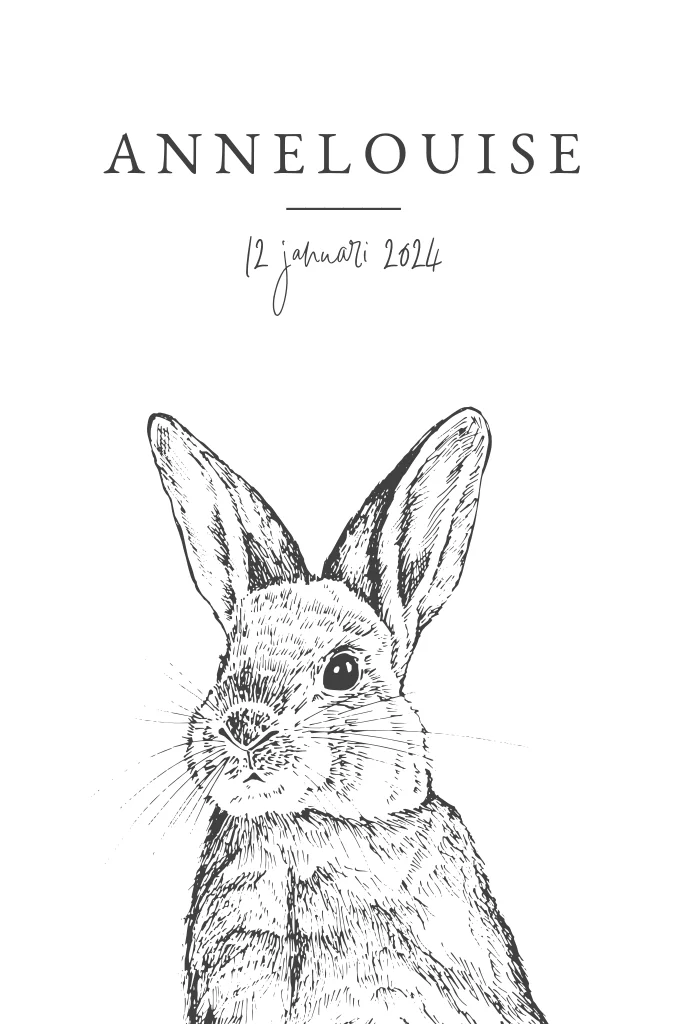 Schattig geboortekaartje met konijntje voor jullie dochter. Maak een mooi ontwerp in de editor en bestel een proefdruk.