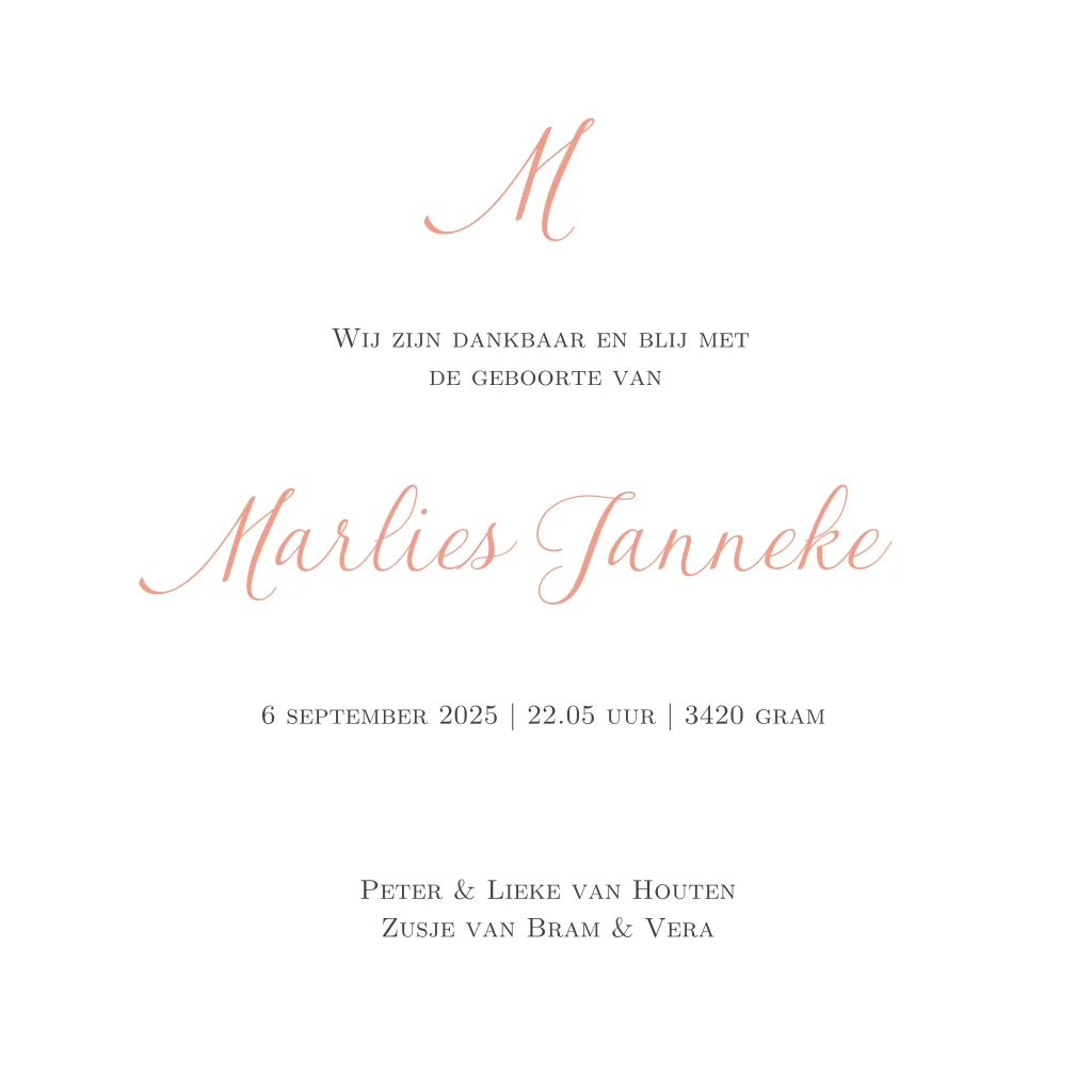 Hou je van klassieke geboortekaartjes en de kleur peach? Maak dan zelf dit geboortekaartje in de editor. Je maakt altijd een origineel geboortekaartje.
