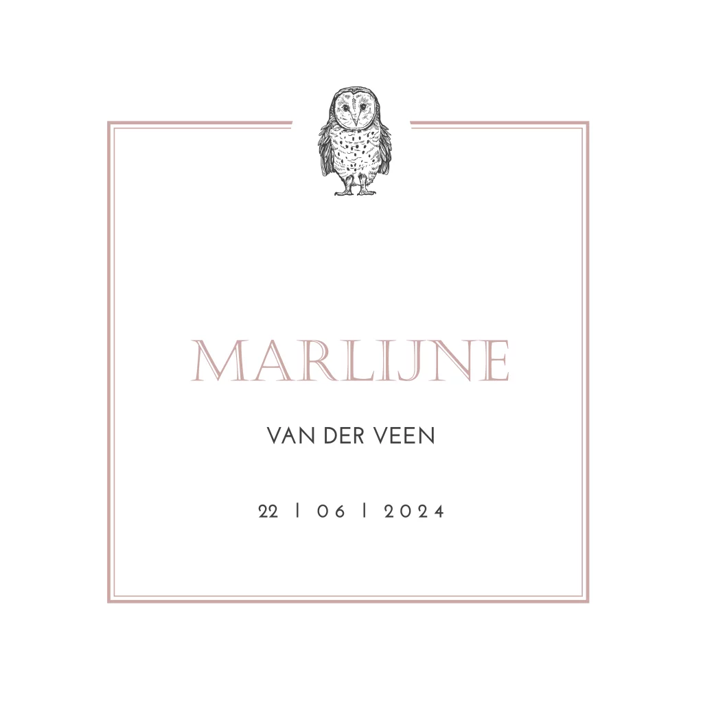 Een lief uiltje op dit klassieke geboortekaartje. Je kunt ook voor een ander diertje kiezen in de editor.