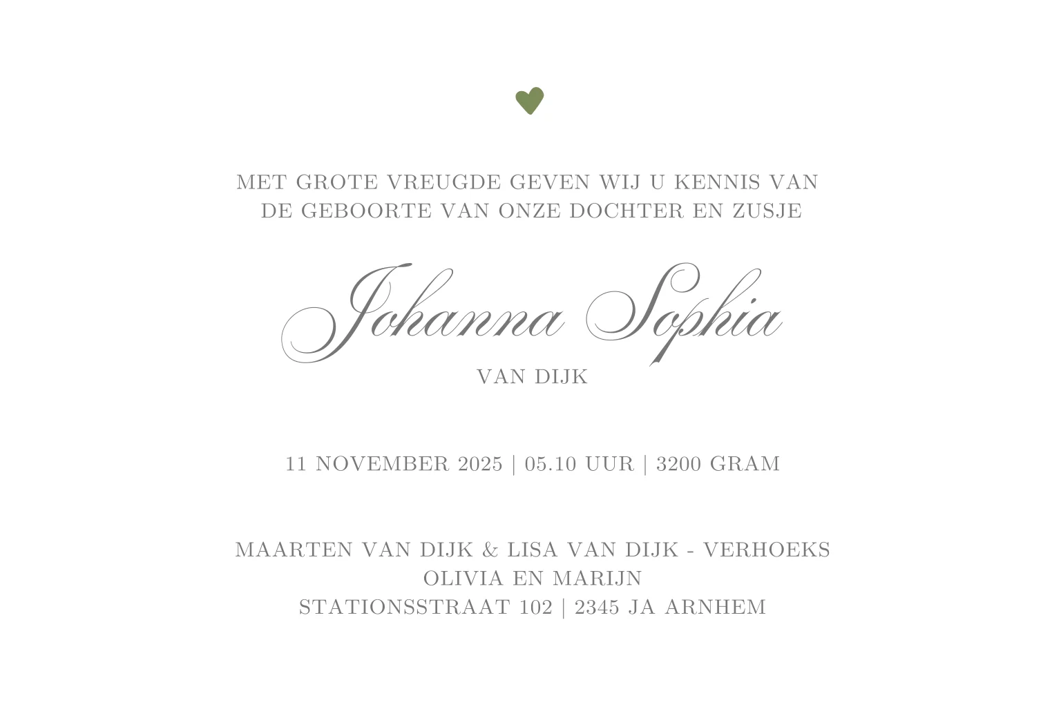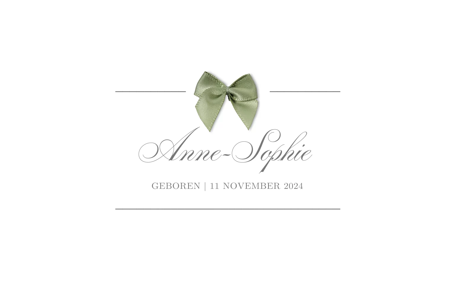 Wij hebben gekozen voor een groen strikje op dit geboortekaartje. We hebben 6 verschillende kleuren strikjes waar je uit kunt kiezen. Zo maak je altijd een origineel geboortekaartje.