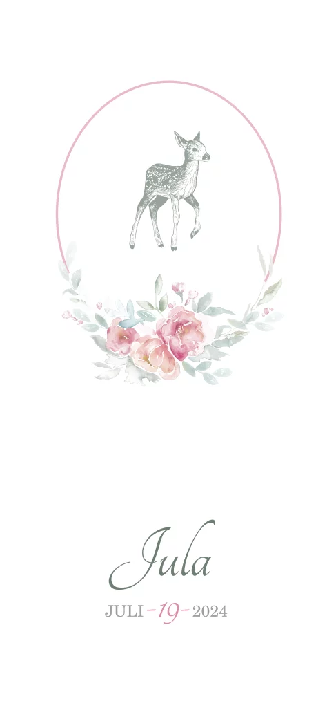 Een meisjes geboortekaartje met hertje en bloemetjes. Wil je in het ovaal een ander diertje plaatsen? We hebben in de editor een hele map met liever diertjes. Dit geboortekaartje wordt gedrukt op het formaat 10 bij 21 cm.