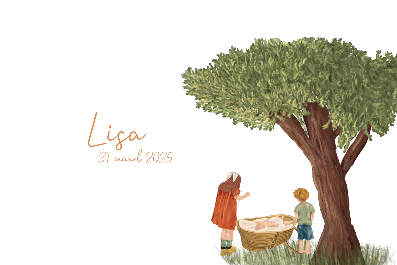 Een prachtig geboortekaartje, perfect voor het voorjaar of de zomer. In het mandje ligt jullie pasgeboren kindje, met een trotse broer en zus ernaast. Deze kaart is aan te passen aan jullie wensen en situatie, zodat het helemaal bij jullie past.