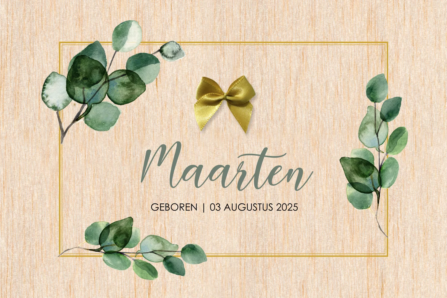 Botanische geboortekaartjes op hout maak je eenvoudig zelf. Met één van onze strikjes maak je helemaal een uniek kaartje. Je bestelt de strikjes apart bij het geboortekaartje. Dus je kunt dit kaartje ook zonder strikje bestellen.