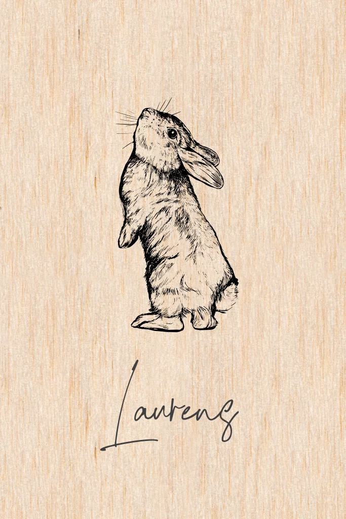 Maak met dit schattige konijntje een geboortekaartje op hout voor jullie kindje. Weet je nog niet of het een jongen of een meisje wordt? Dan is dit een mooi unisex kaartje om klaar te zetten in je account. In de kaartopmaker kun je alle teksten aanpassen zodat je een liefdevol houten geboortekaartje maakt. Bestel daarna een proefdruk.