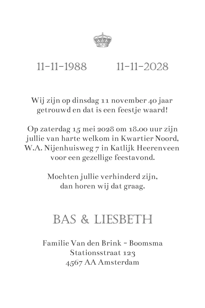 Een klassieke jubileum uitnodiging met een kroontje. Deze jubileumkaart kan naar eigen wens aangepast worden in de editor.