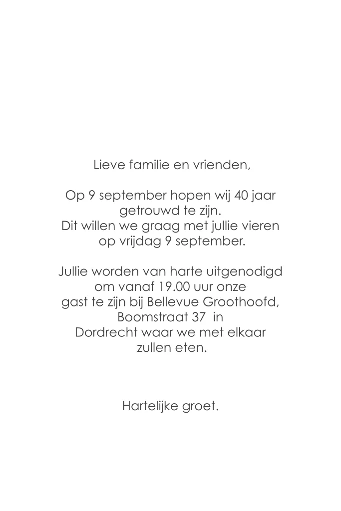 Een klassieke jubileumkaart met sierlijke letters voor 40-jarig jubileum in zilverfolie. Deze kaarten hebben een koninklijke allure door het gebruik van zilverfolie. De verschillende lettertypes maken de eenvoudige kaart de perfecte klassieke jubileumkaart.