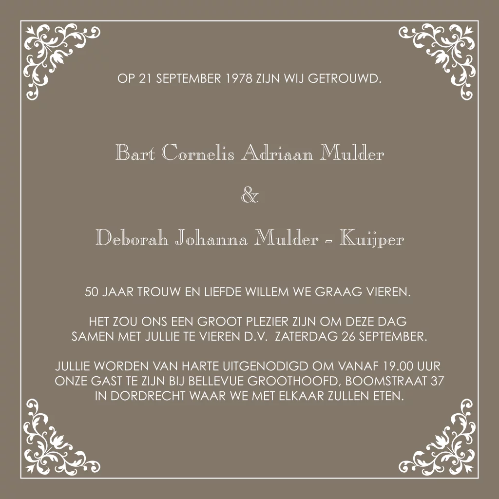 Een klassieke jubileumkaart voor 50 jaar getrouwd. Wijzig eventueel in de kaartopmaker het jubileumjaar. Voor elk jubileum is dit ontwerp te gebruiken. De kleur kun je ook aanpassen! Begin nu met het maken van jullie uitnodiging.