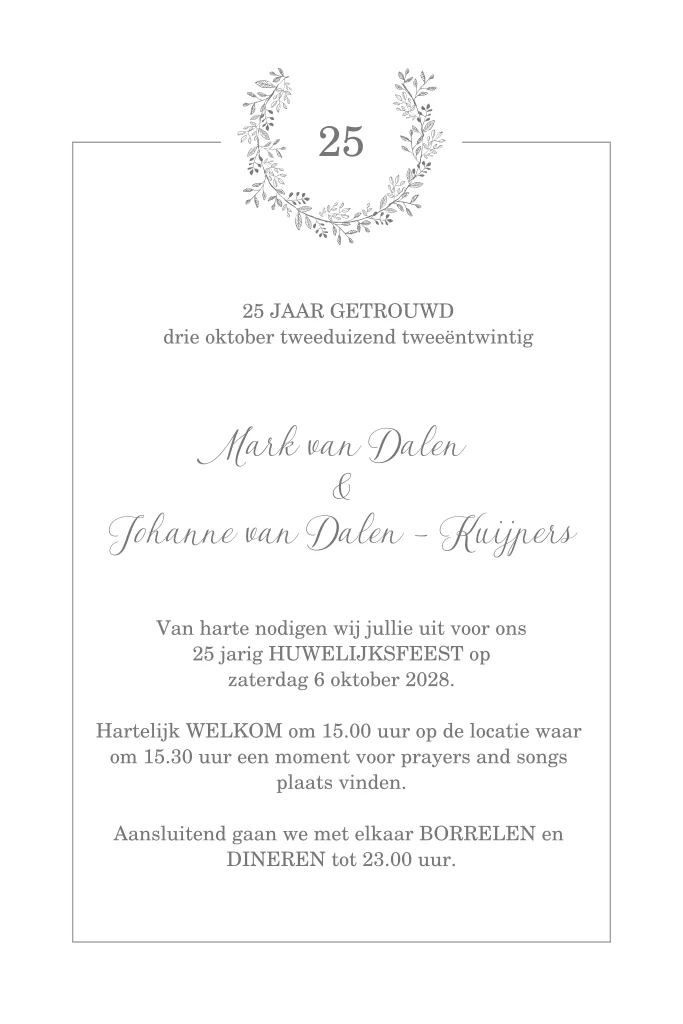 Een klassieke jubileumkaart met een kransje voor een 25-jarig jubileum. Deze kaart kan ook gebruikt voor andere jubileums. Alleen de tekst hoeft hiervoor aangepast te worden.