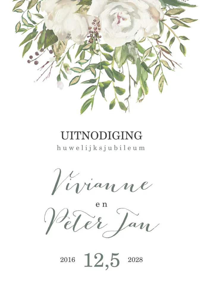 Een romantische jubileumkaart voor 12,5 jaar getrouwd. Klassieke en romantische bloemen met trendy letters zijn gecombineerd in deze jubileumkaart.