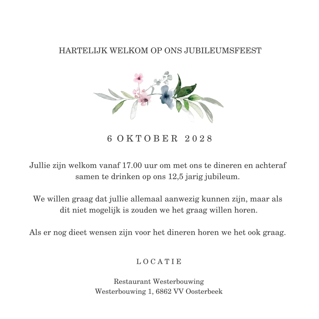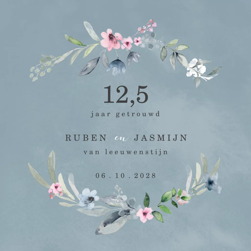 Een romantische jubileumkaart met bloemen voor een 12,5-jarig jubileum. Kies deze unieke jubileumkaart als je stijlvol en trend met elkaar wilt combineren. Stijlvolle opmaak met de mooie letters en bloemetjes op een dubbele vierkante kaart.