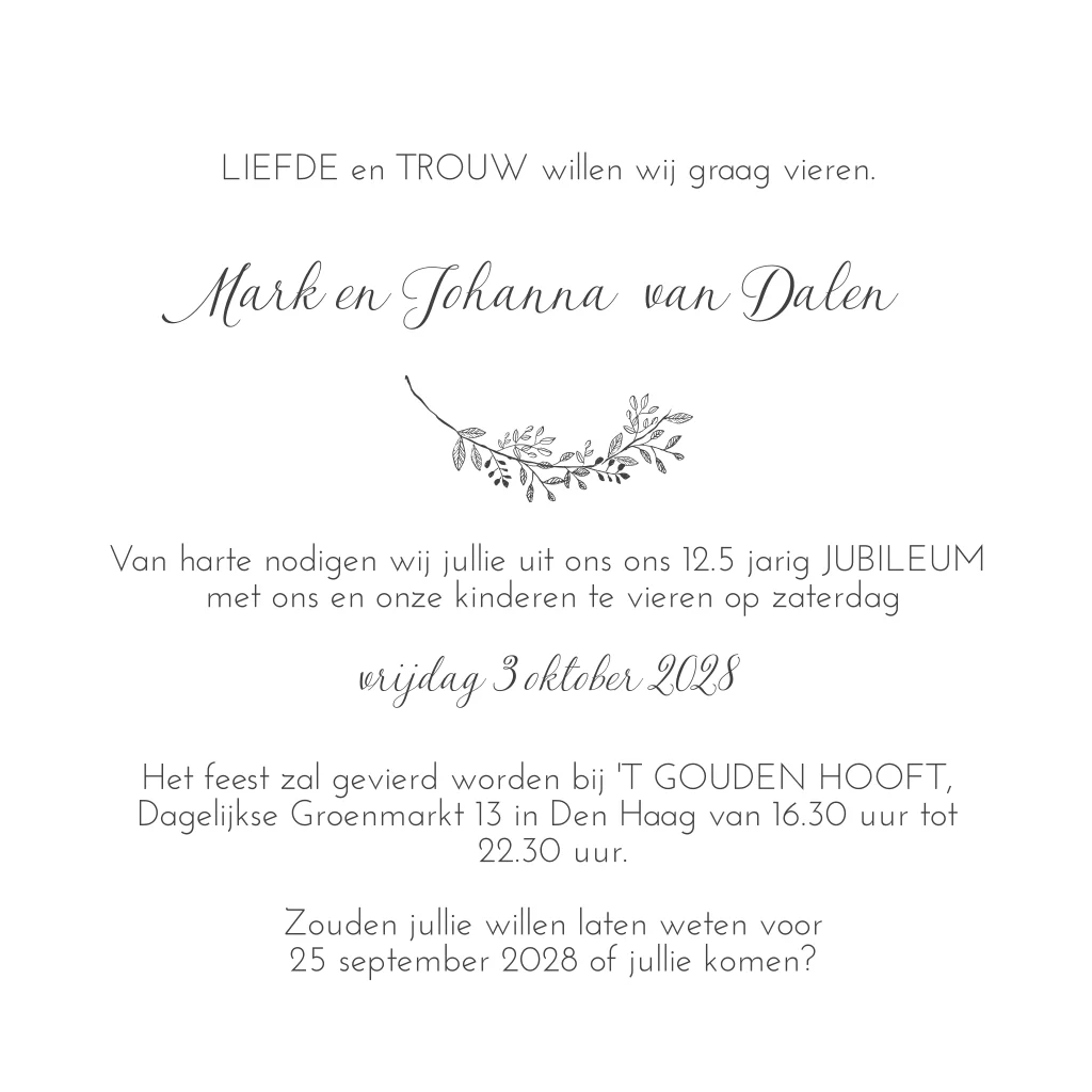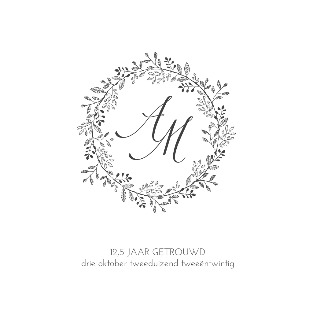 Een klassieke kaart voor 12,5 getrouwd met een kransje. Alle onderdelen in de trouwkaart kunnen worden verschoven en van kleur worden veranderd. Deze kaart is gemaakt voor een 12,5 jarig jubileum, maar elk jubileum jaar kan ingevuld worden.