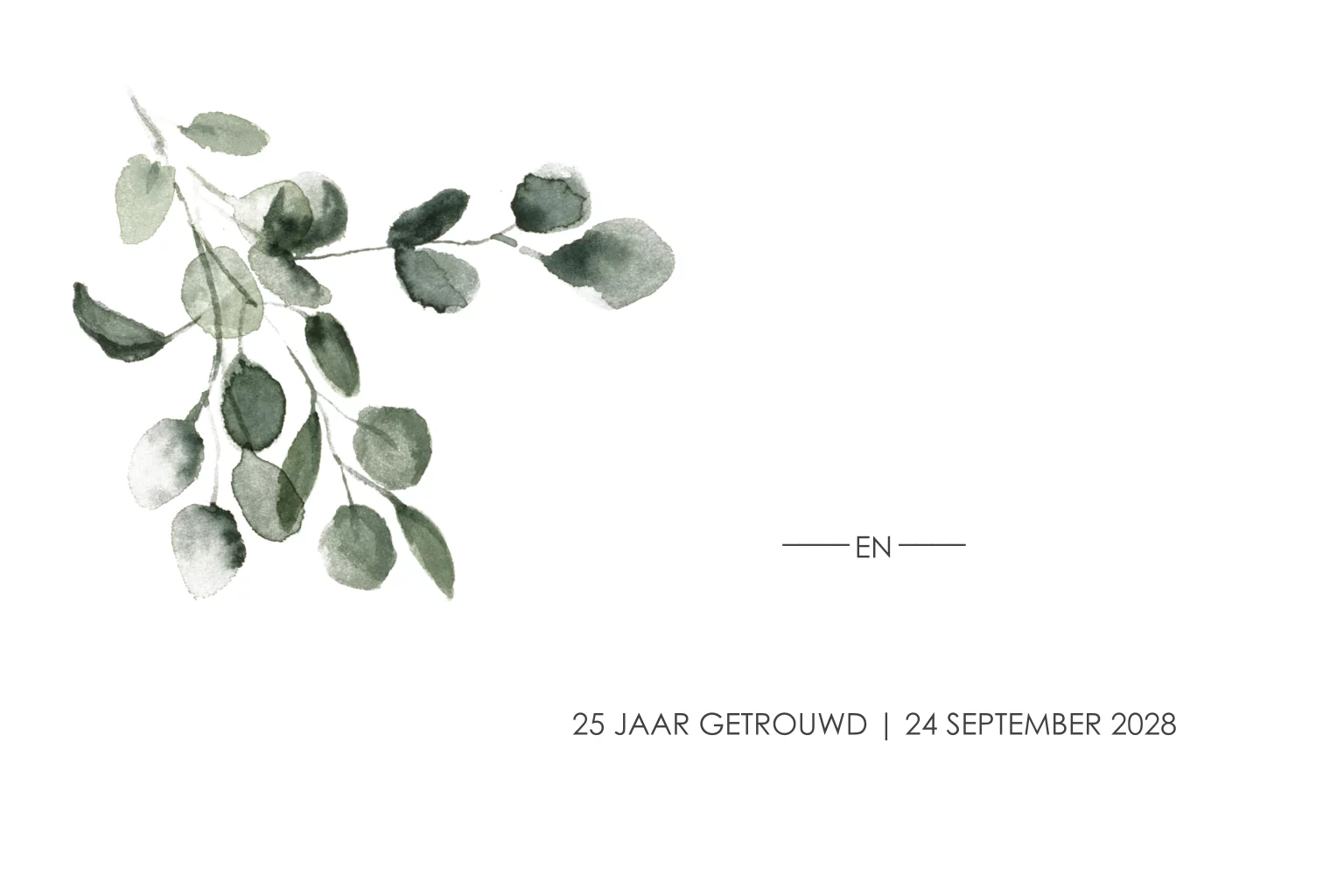 Een trend jubileumkaart voor als jullie 25 jaar getrouwd zijn. Dit is een enkele liggende kaart van papier. Liever een dubbele kaart? We kunnen dit aanpassen. In de kaartopmaker kunt ook uit allerlei andere soorten takjes en kleuren folie kiezen.