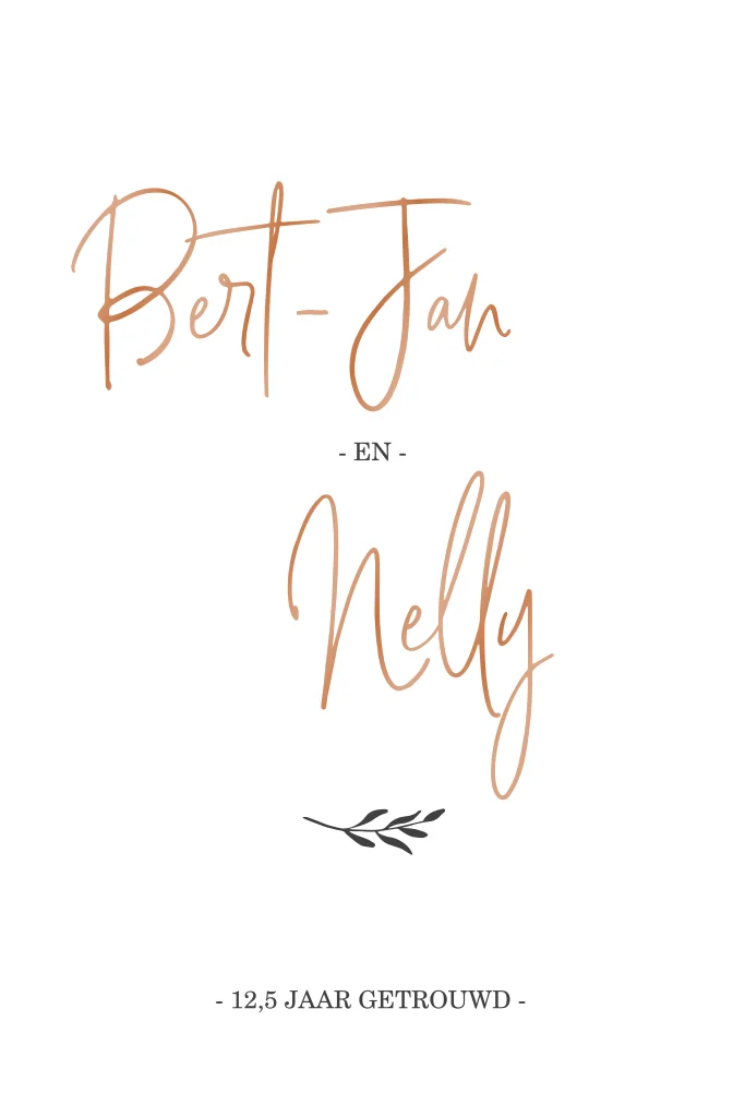 Een uitnodiging voor 25 jaar getrouwd met koperfolie en een takje. De datum en het aantal jaar getrouwd kan aangepast worden naar jullie situatie. De kleur van de folie kan aangepast worden naar andere kleuren.