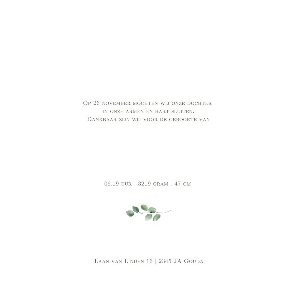 Lief zijn de vele hartjes op de voorkant van dit botanische geboortekaartje voor een meisje.