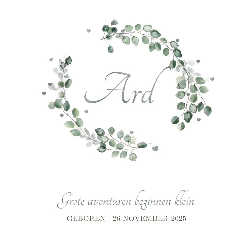 Op de voorkant en achterkant van dit botanische geboortekaartje met schattige hartjes wordt hoogglans gedrukt. Je kunt in de editor ook een andere kleur hoogglans kiezen.