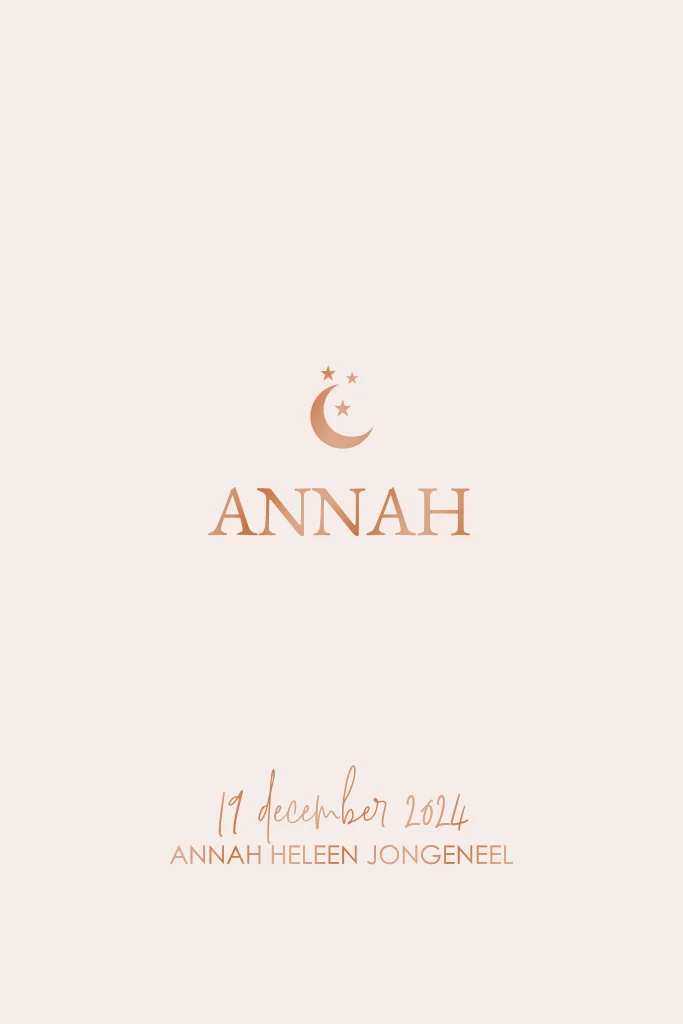 Een lief geboortekaartje waar bij de naam van jullie meisje ene paar sterretjes en in maan in koperfolie zijn geplaatst. Je kunt het ontwerp aanpassen naar eigen wens zodat het een origneel geboortekaartje wordt.