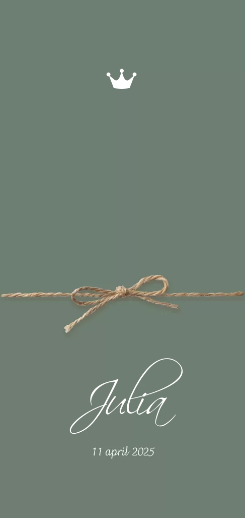 Een geboortekaartje voor meisje met kroontje in goudfolie. Om dit geboortekaartje kun je één van onze touwtjes strikken. Op de voorkant en achterkant wordt goudfolie gedrukt. De afmeting van dit geboortekaartje is 10 bij 21 cm.
