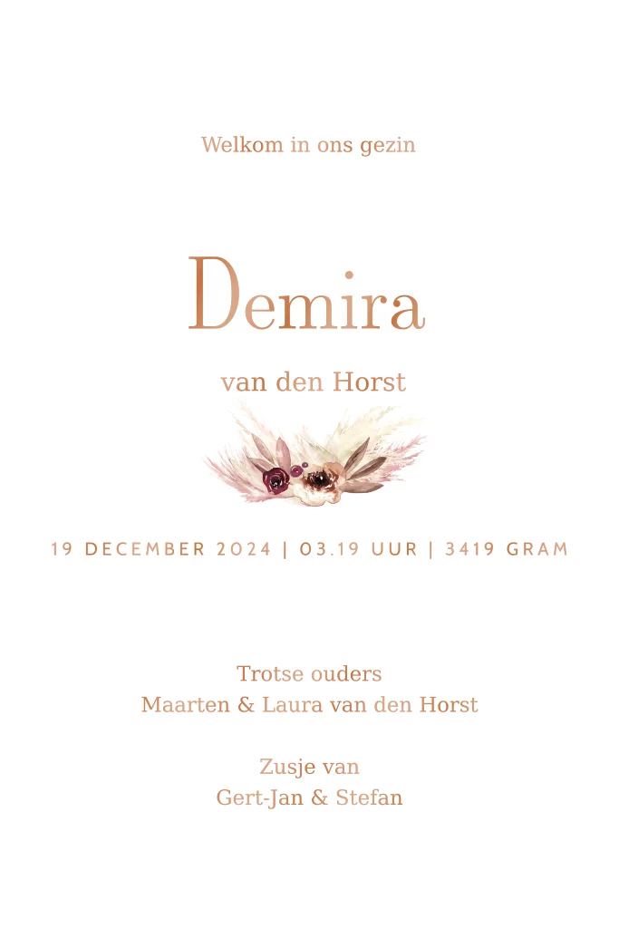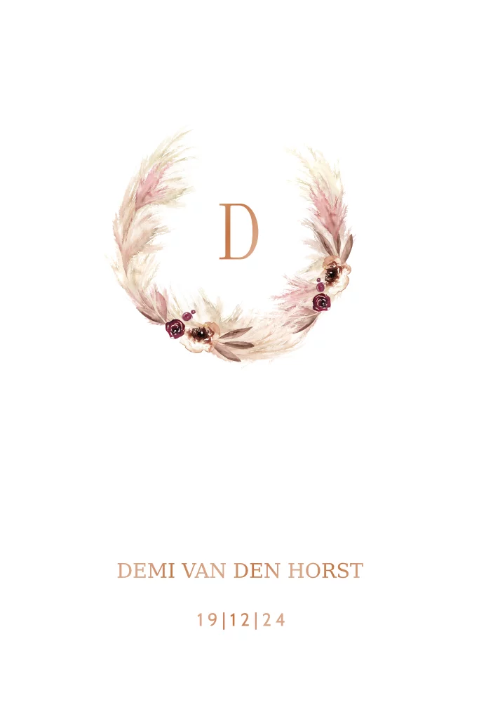 Dit geboortekaartje heeft een mooi open bloemenkransje van droogbloemen. De trend van nu! Alle teksten worden met koperfolie gedrukt, maar je kunt in de editor ook een andere kleur folie kiezen. Onze roestbruine envelop past hier mooi bij.