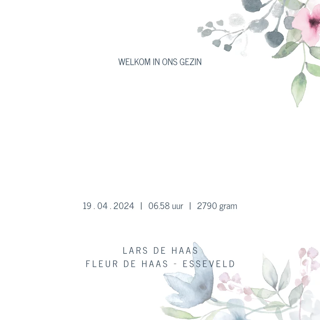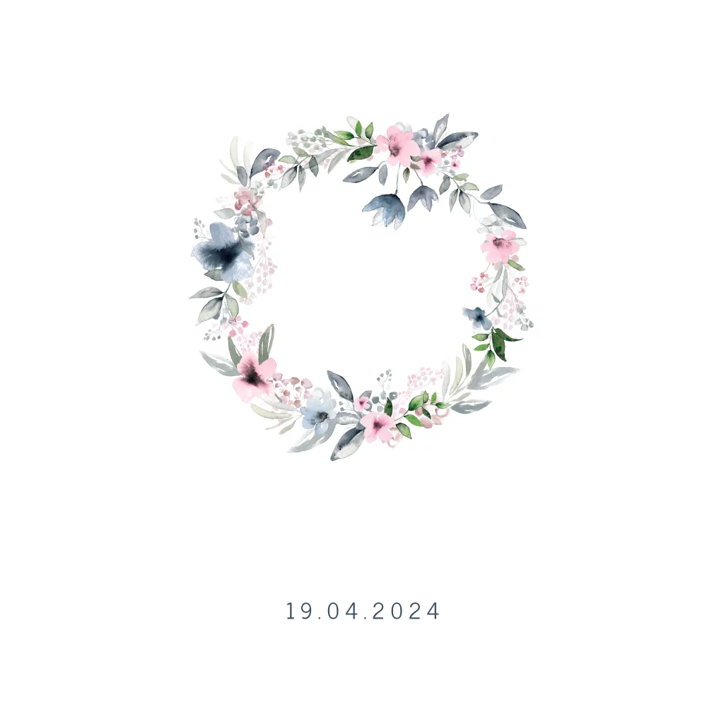 Kies voor dit lieve geboortekaartje met een blauw roze bloemenkransje. Op alle zijden wordt zilverfolie gedrukt. Je kunt ook voor een nadere kleur folie kiezen in de editor. Zo maak je altijd een origineel geboortekaartje.