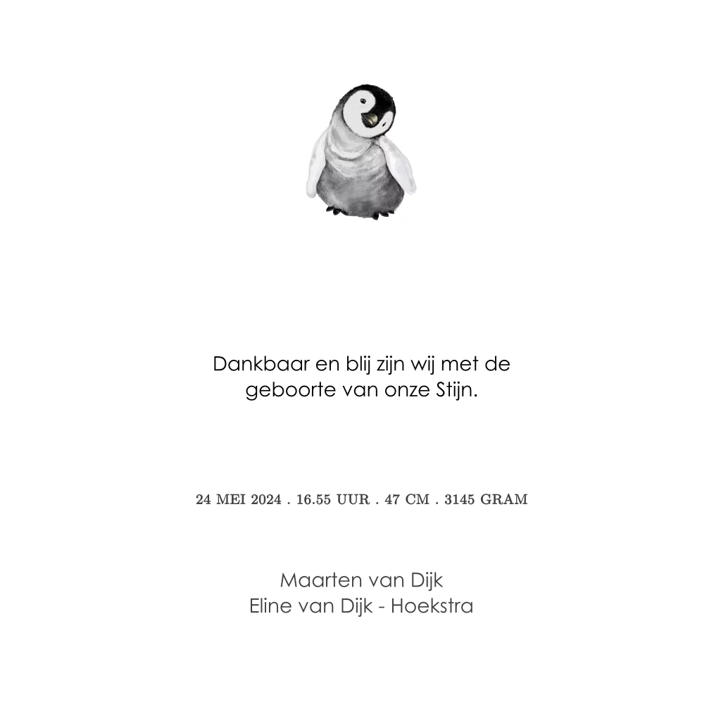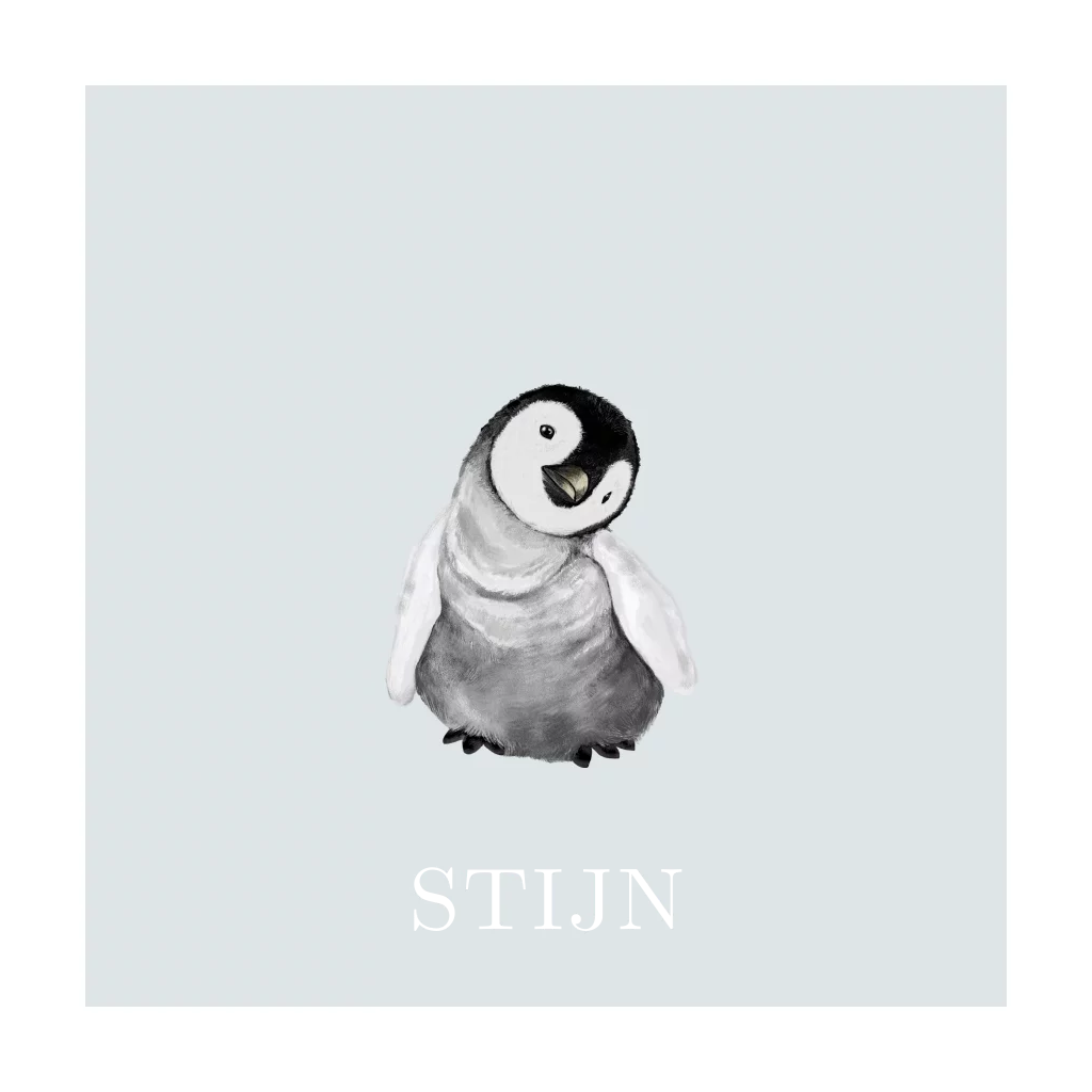 Geboortekaartje voor een jongen met pinguïn. De naam van jullie zoontje wordt met zwartfolie gedrukt. Je kunt dit lieve geboortekaartje in de editor helemaal aanpassen naar eigen wens.