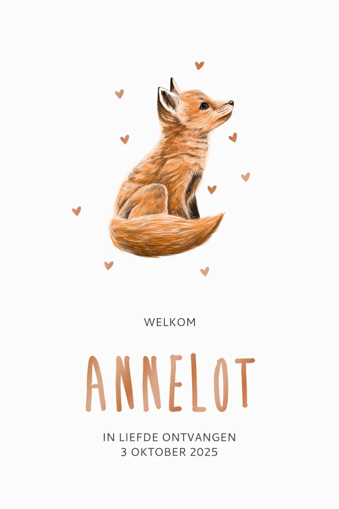 Lief geboortekaartje met vosje voor een meisje. De naam en hartjes worden met koperfolie gedrukt. Je kunt ook een ander diertje of een andere kleur folie kiezen in de editor. Je maakt bij ons altijd een origineel geboortekaartje.