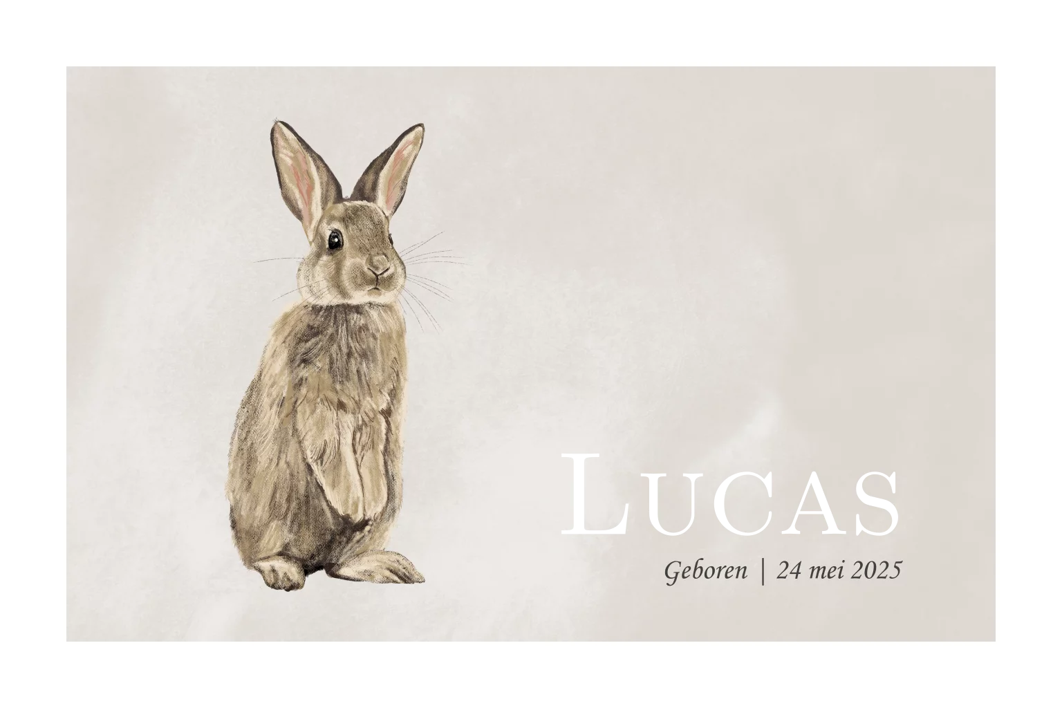 Geboortekaartje voor jongen met een konijntje. De naam wordt op de voorkant met goudfolie gedrukt. Je kunt ook voor een andere kleur folie kiezen. Zo maak je altijd een origineel geboortekaartje