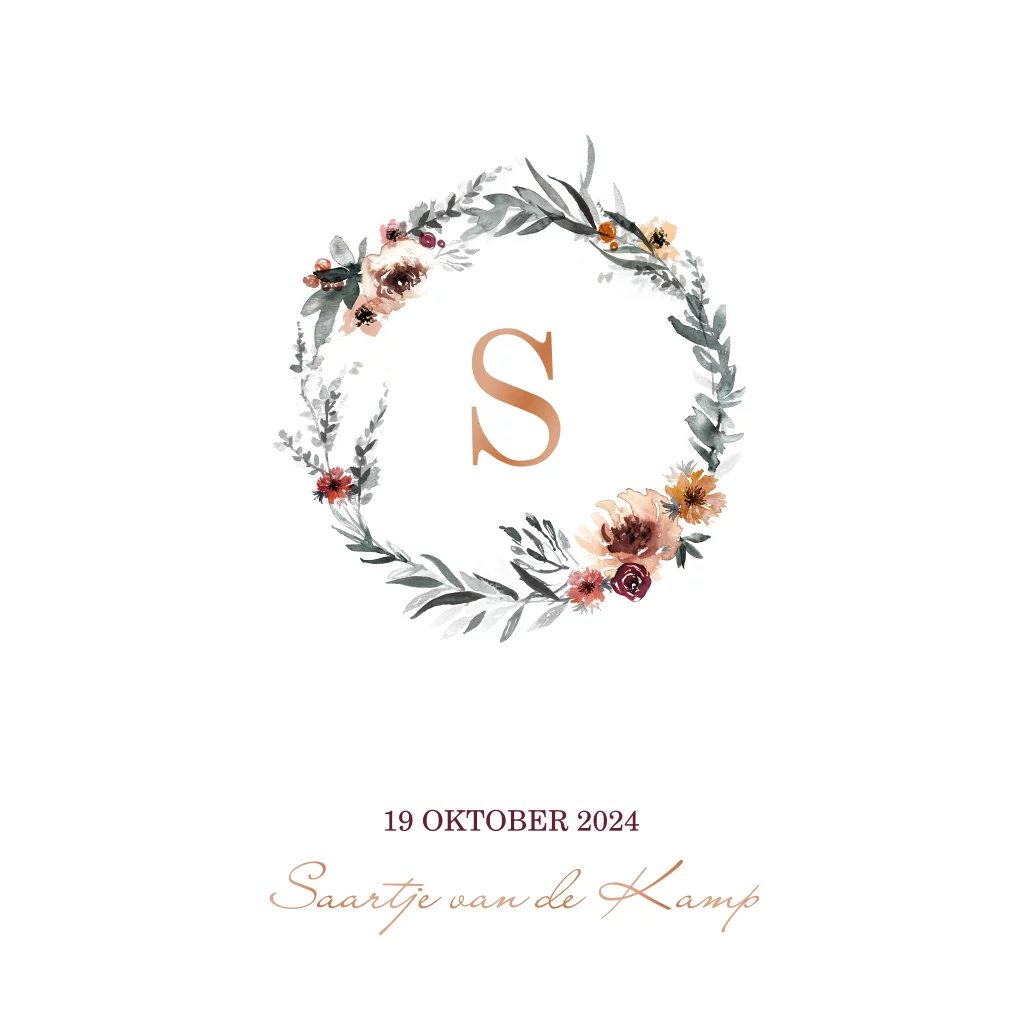 Een romantisch geboortekaartje met bloemenkransje in roest bruine tinten. Op alle zijden wordt koperfolie gedrukt. Je kunt ook een andere kleur folie kiezen.