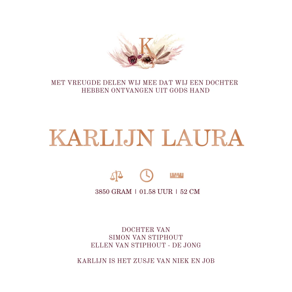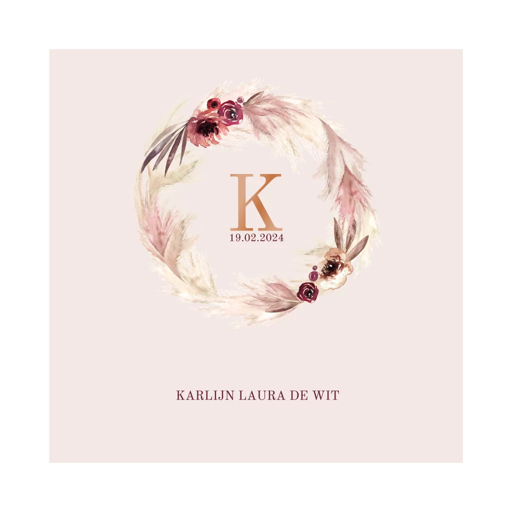 Een stoer meisjes geboortekaartje met koperfolie en kransje van droogbloemen. Op alle zijden wordt koperfolie gedrukt. Je kunt ook voor een andere kleur folie kiezen in de editor.