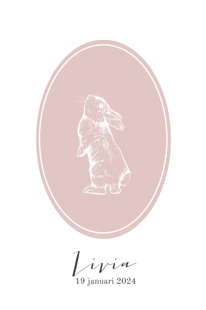 Feestelijke zijn de vele hartjes op dit geboortekaartje voor een meisje. Wij hebben gekozen voor een konijntje in roséfolie. In de beeldbank kun je ook andere lieve diertjes vinden.
