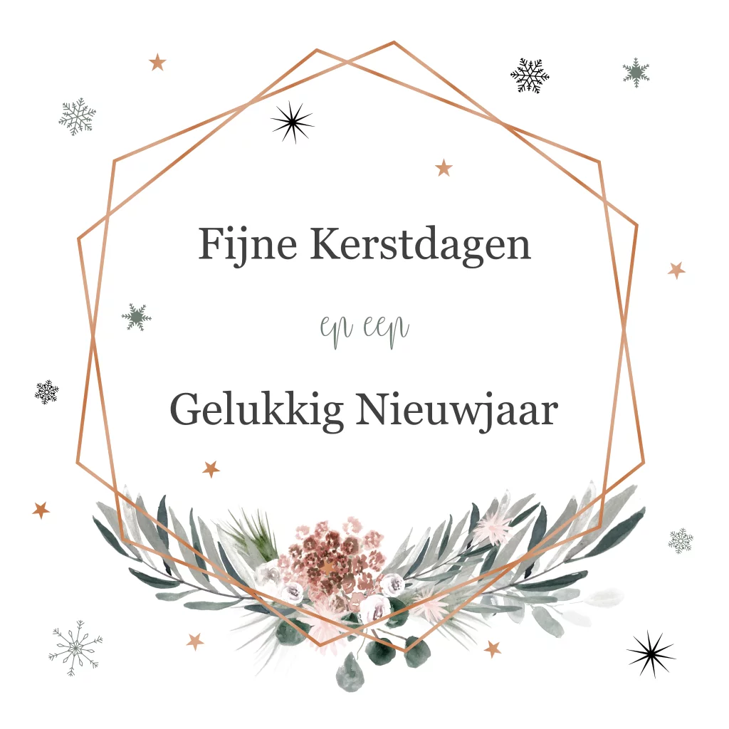Een stijlvolle kerstkaart met koperfolie en eucalyptus takjes.